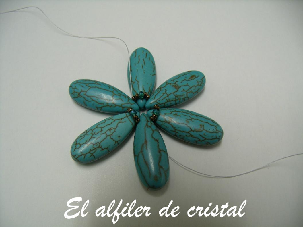 2-Enfilamos dos rocallas del 15, una del 11 y dos del 15 pero un pétalo sí y otro no, como muestra la foto.